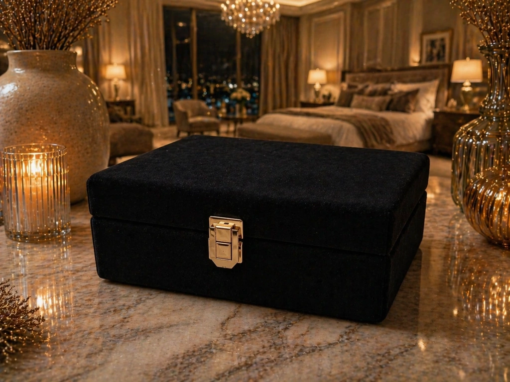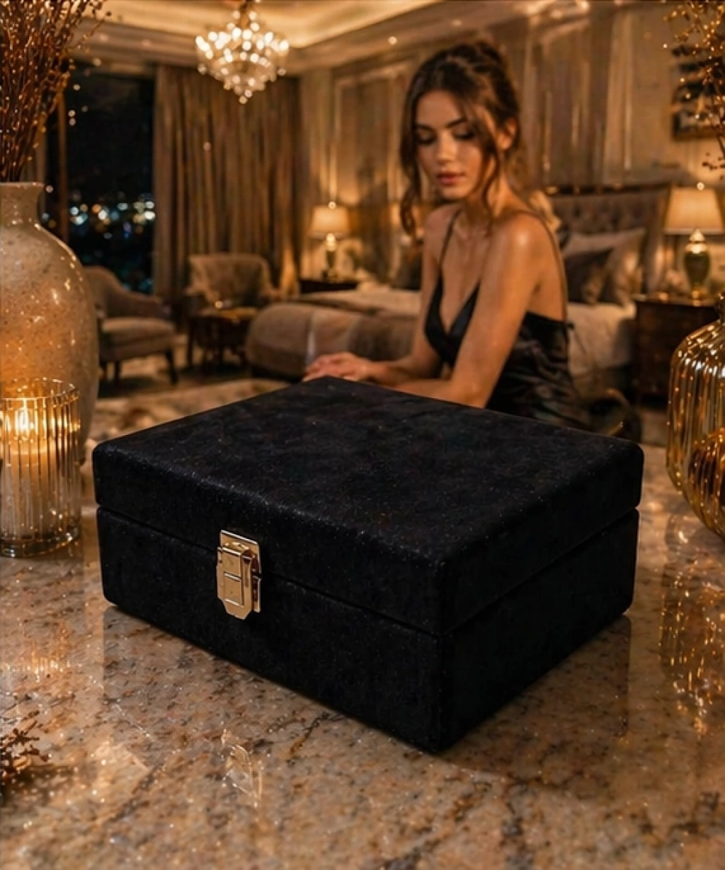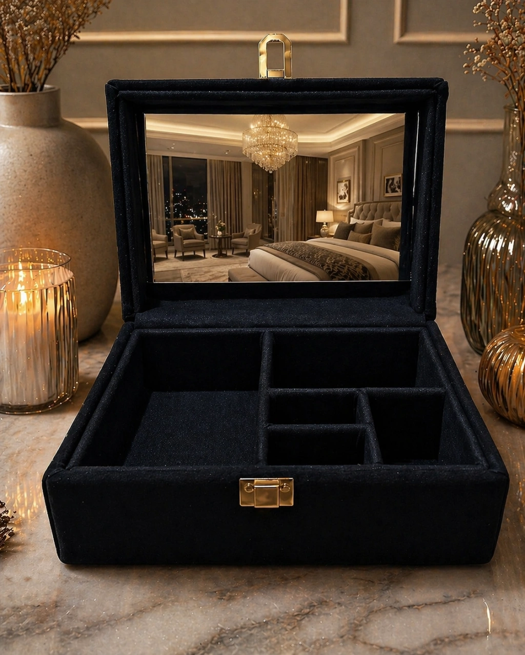 Shellwetr Hilton takı kutusu, şıklığı ve geniş tasarımıyla lüks kumaş kullanılarak üretilmiş bir takı kutusudur.