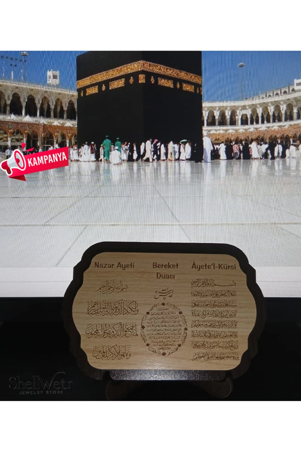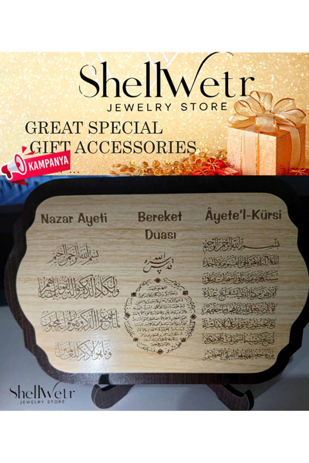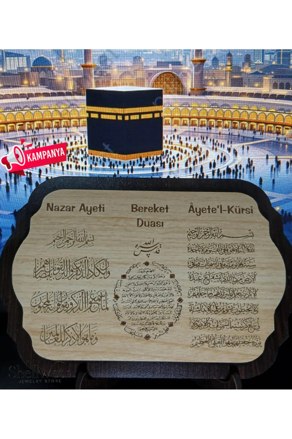 - Nazar Ayeti, Bereket Duası ve Ayet-el Kürsi gibi dini sembollerin yer aldığı bu masaüstü dekorasyonu, hem evinizde hem de ofisinizde manevi bir atmosfer yaratır.; - MDF malzemesinden üretilmiş olup dayanıklılığı ve uzun ömürlü kullanımı ile ön plana çıkar.; - Mono kapama özelliği sayesinde kolayca açılıp kapanabilir; böylece istediğiniz zaman ayetleri görebilirsiniz.; - Kutulu tasarımı ile şık ve düzenli bir görünüm sunarken, aynı zamanda taşıması da oldukça pratiktir.; - Yıkama talimatlarına uygun şekilde temizlenebilir olması, ürünün bakımını kolaylaştırır ve hijyenik kalmasını sağlar.; - herkes tarafından rahatlıkla kullanılabilir; evinizin veya ofisinizin dekorasyonuna zarif bir dokunuş ekler.;