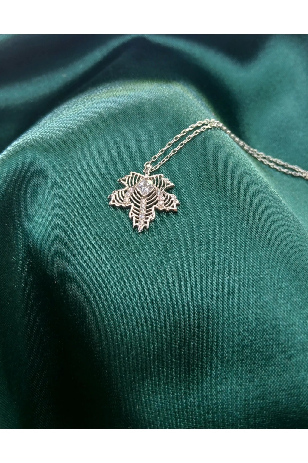 - 925 ayar gümüş malzemesiyle üretilmiş, uzun ömürlü ve kaliteli bir aksesuar deneyimi sunar.; - Kadın ve kızlar için özel olarak tasarlanmış, zarif yaprak formundaki tasarımıyla dikkat çeker.; - Yetişkinlerin zarafetini yansıtan bu kolye, her yaş grubuna hitap eder.; - Göz alıcı zirkon taşlarla süslenmiş yaprak detayı, ışığı mükemmel şekilde yansıtarak göz kamaştırır.; - Gümüş rengiyle her türlü kıyafetle kolayca uyum sağlar ve şıklığınızı tamamlar.; - 45 cm üzeri beden seçeneği ile farklı boy seçeneklerine uygun olarak tasarlanmıştır; kişisel tercihinize göre ideal uzunluğu seçebilirsiniz.
